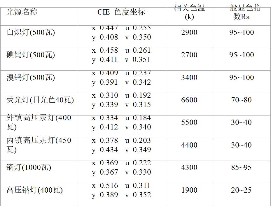 •标准照明体C:代表相关色温大约为6774K的平均日光。它的光色近似阴天天空的日光,其色度点位于黑体轨迹的下方。