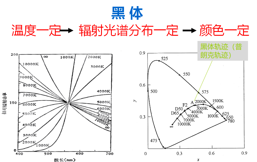 •色温:当某种光源的色度(坐标)与某一温度下的黑体色度(坐标)相同时,就称此时黑体的温度为该光源的颜色温度,简称色温,用符号Tc表示,单位为开尔文,用“K”表示。