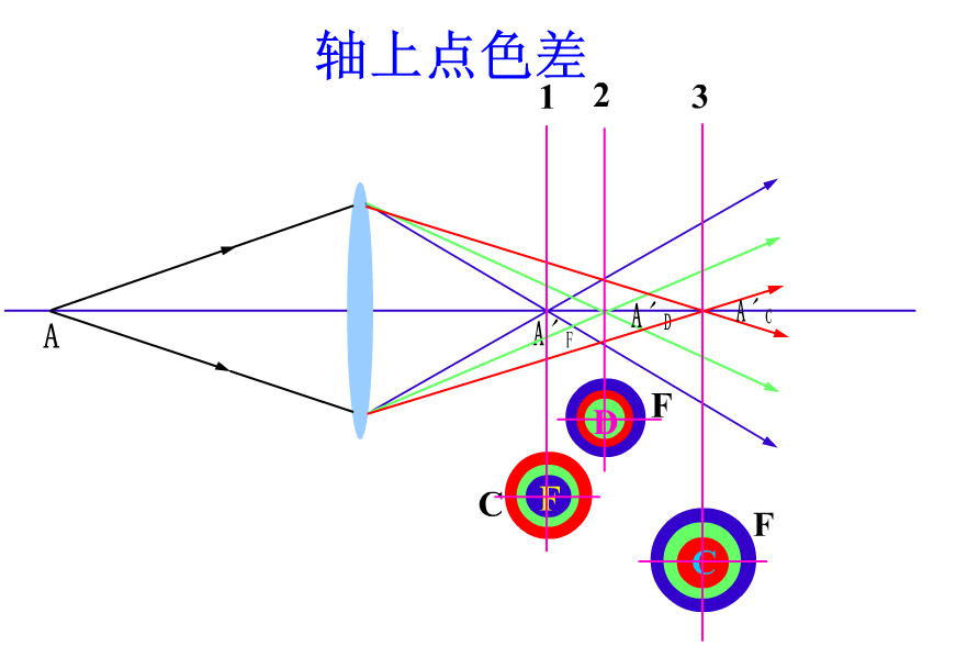 u点物不能成点像,而得到不同位置的单色像,某一截面为彩色弥散斑