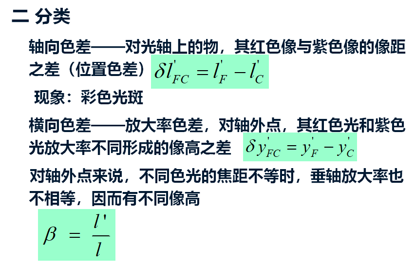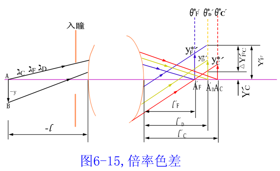 u倍率色差严重时,物体的像有彩色边缘,即各种色光的像轴外点不重合。因此,倍率色差将破坏轴外点像的清晰度,造成白色像的模糊