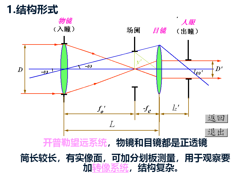 u物镜框是孔径光阑,也是入瞳u出瞳在目镜外面,与人眼重合u物镜的后焦面上可放置分划板,分划板框是视场光阑
