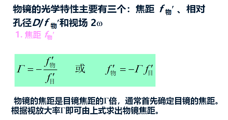 显微镜的总放大率为Г =βo Гe=-2.5×15=-37.5,总焦距为f’=250/ Г =-6.67mm。