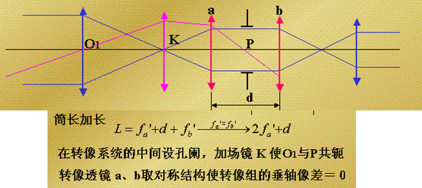 单组透镜转像系统,对于-1倍单组转像透镜,筒长加长了4倍转像透镜的焦距