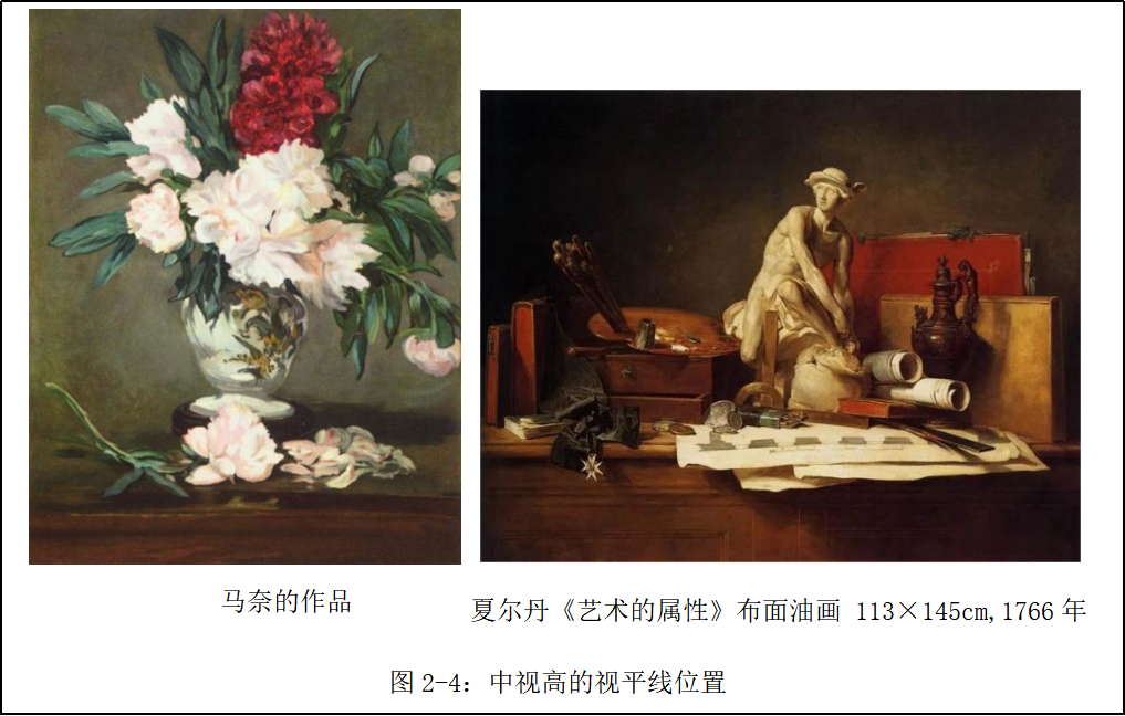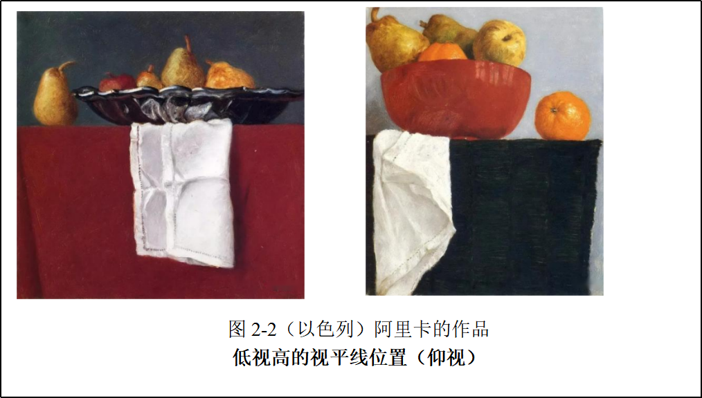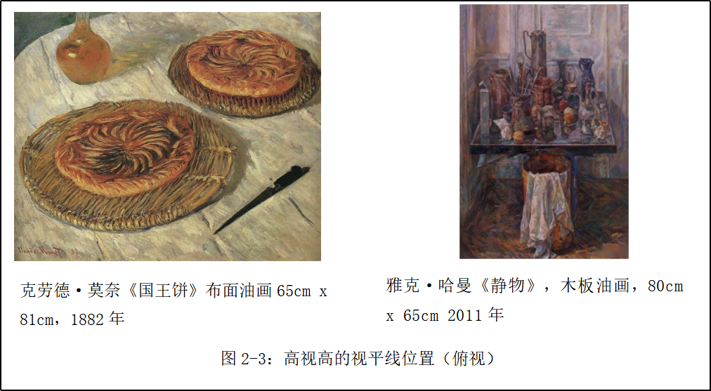 给人居高临下观景的效果,适合展示复杂宏大的场面和人物群像。在静物画中能表现出放大静物以特写的视觉感受,见图2-3。