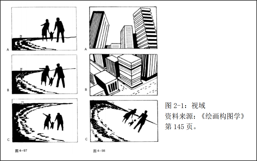 视高指绘画者平视状态眼睛的高度。视高与视平线规定了物象在构图中的安排的方式和透视状态。不同视高的视平线都可以置于画面上、中、下不同的位置。视平线在构图中的位置对主体对象的形式作用影响极大,对画面空间表现起着一定的支配作用。