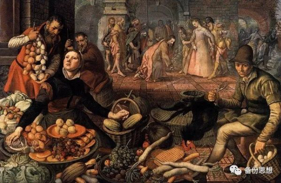 阿姆斯特丹画家阿尔岑的作品主要取材于市场景色,从他的作品中,我们确实能感受到荷兰当时的社会、经济及市井繁荣的图景,阿尔岑的画更多地体现出风俗画特征,但是如果细细品味他的一些作品,会很快被描绘精致的物品打动,阿尔岑的作品从不缺乏厨房与集市,以《基督与奸淫的女人》(见下图)为例,初入眼帘的是集市上卖蔬菜的农妇和手抓家禽的农夫,远处才是基督、淫妇与众人。阿尔岑故意把画面重点倒置,并且故意刻画了两群互不相干的人,集市上的人们无一回头观看,前后没有视线上的吸引与交流。