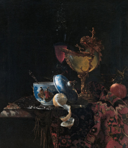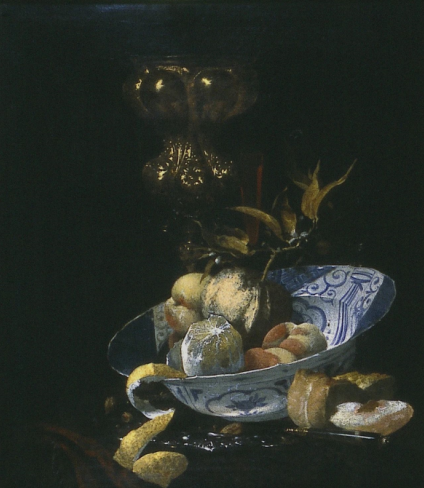 威廉·卡尔夫是与贝耶伦同时代的画家,与贝耶伦的不同在于他除了突出画面的奢华感外,同时,对追求高雅的文化品位表现出了更大的兴趣。他早期在巴黎,在那里他画了些庄园题材的室内景物。在他的画中,物的数量明显减少,而是专注于物体本身的美学元素,因此,他的作品(见下图)呈现出与贝耶伦迴然不同的风格特征。虽然,他总是描绘那些精美的事物,如中国陶瓷汤碗、昂贵的鹦鹉螺式酒杯等,但是,他的作品看起来不再以财富及繁荣为主导,而是由这些事物所提供的美学价值以及视觉享受为支配,这样,物体上光线的折射,各事物相互间颜色的映衬成了他艺术的真正主题。卡尔夫静物画的魅力来自于对光与色的研究和独有的敏感,他给主体物较为集中的明光,加深背景的暗光,使整幅画予人静穆而优雅的效果,这显然是受到了意大利画家卡拉瓦乔的影响,但它的光线更趋柔和,且疏离有致。似乎这样的光线分散了物体本身的物质感,除了对光的巧妙处理之外,对于如何把握与再现物体感,画出任何玻璃工艺匠也做不出来的华美酒杯,他给包容了其他所有收益的艺术——绘画,在更高的层面上予以定位。
