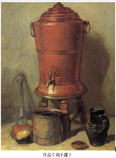 在他著名的《铜水罐》中,夏尔丹真实地表现了水桶表面油漆剥落的块块疤痕,他以朴实的色调、忠实的造型描绘了普通人所用的水罐。这个水罐实在太寻常了,就像他的碟子、水果、面包、酒瓶、刀叉那样普通到人们天天在用、司空见惯却谁都不会在意它们的存在。但正是这种如海德格尔所说的器具的“上手状态”,即在用途中,人对它们想得越少,对它们的意识越模糊,它们的存在就越真实,就越能揭示出人的实际生活世界。夏尔丹的画面构成了一个“世界”,而这个世界便是一种家的感觉。