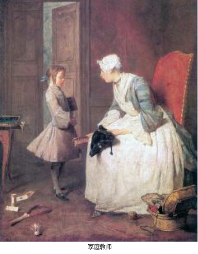 《家庭教师》依然是一幅描写平民生活、平民情趣的作品。画面人物有两个:年轻的家庭女教师和她所教的孩子。两位主人公力的趋向集中在一点上,从而使这幅画极富张力之美。画家捕捉住了两人沉浸在自己教和学的活动中的专注神情,年轻的女教师努着嘴唇,拿着教杆,伸着手,孩子则用圆胖的小手压指着书本,女教师的认真和孩子用心却又有些许笨拙的样子,都饶有兴致。