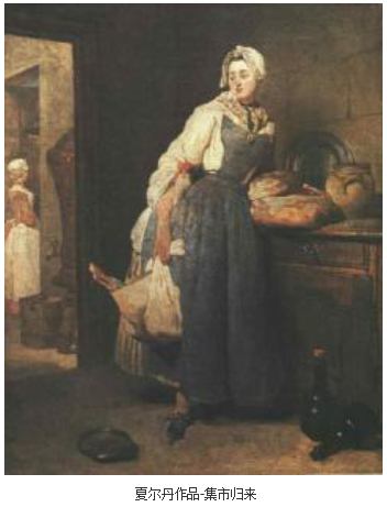 《集市归来》中刚从市场买菜归来的女主人一进屋就把左手拿着的颇具分量的食物放在橱柜上,右手还拎着一包没来得及放下的东西。因为喘了一口气,主妇有一种如释重负的轻松感。女主人穿着朴素却也耐看的蓝衣裙,和地面、墙壁的淡黄色相得益彰,微斜的身姿显出了女性的线条,脸上的红润显示着健康。屋里陈设简单,却也朴实宜人。由此可见,夏尔丹描写的不是辛苦挣扎着的生活,而是普通平凡却也充实、和美的人生。