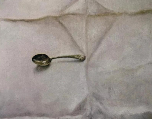 在阿利卡的静物画中,俯视构图占了很大比重,对此,我们丝毫没有枯燥和雷同的感觉。物体常常是以随意的状态出现在画中,但其中所隐含的真实却又不尽相同,有的甚至是阿利卡真实感情的写照。《山姆的勺》(见下图)就是一幅倾泻情感之作,这把勺是自己的朋友,荒诞派戏剧家贝克特送给阿利卡刚出生的女儿的(贝是其女儿的教父)。贝克特的去世使阿利卡陷入极度的痛苦之中,画家一年没有提笔画画,在贝克特去世一年之际,他却画了这幅惊人的作品来纪念贝克特。画面上只有一把孤零的小银勺躺在有着几条褶皱的白亚麻上(褶皱颇象一个十字架)尽管阿利卡一直反对在视觉上“阅读”出来某种情节的内容,但这幅画却不能排除它与具体事实的联系。基于以上的背景,这把勺子象征着生命的延续。