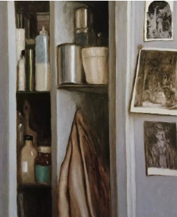 《工作室的角落》(见下图)是一件比较典型的阿利卡式的构成,画家将搁置材料橱架的一段作为对象,显然作出这样的视觉选择带有一定的偶然和偏好,因为,他相信平淡的物体中可能具有的意义,这些似自由摆放、未经修饰的物品,被几条垂直线牢牢地规范在一个稳定的视觉秩序里。