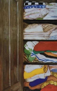 《毛巾和被单》(见下图)与上面谈到的作品属于同一种构成类型,画家似乎有意识地摒弃了传统绘画中惯常的空间概念,而着意发挥二维空间的效力,伴着徐徐开启的衣橱门,生活的万花筒骤然间呈现在我们的视线里,或许这里有画家的隐私,以及许多等待揭秘的东西。三度空间的舍弃并不等于阿利卡鄙视一切传统,三条黑色的水平隔线和门的垂直关系是典型的传统绘画要素,只不过在阿利卡的画中,这些因素已经悄悄地融入作品的意境之中,被赋予了更多的形式意味。阿利卡曾读过一本印度教的经典,对其最早阶段的婆罗门教非常入迷。婆罗门教的神被想象为一位能使宇宙集现实与幻觉于一身的神:现实即是一种幻觉,因为它不再延续。这种信念与阿利卡后来的艺术在精神上有相似之处,迅速抓住那转瞬即逝的真实就与之存在一定的关联。从这幅画中,我们也能感觉到画家正在搜寻的目光,处于边缘的木楼梯仿佛正在等待声音的出现,顺着搁置于画架上画框的透视线,我们的视线随即被引向屋外,入眼帘的是一个若隐若现的外部世界,清淡之中透着几分撩人的气息。