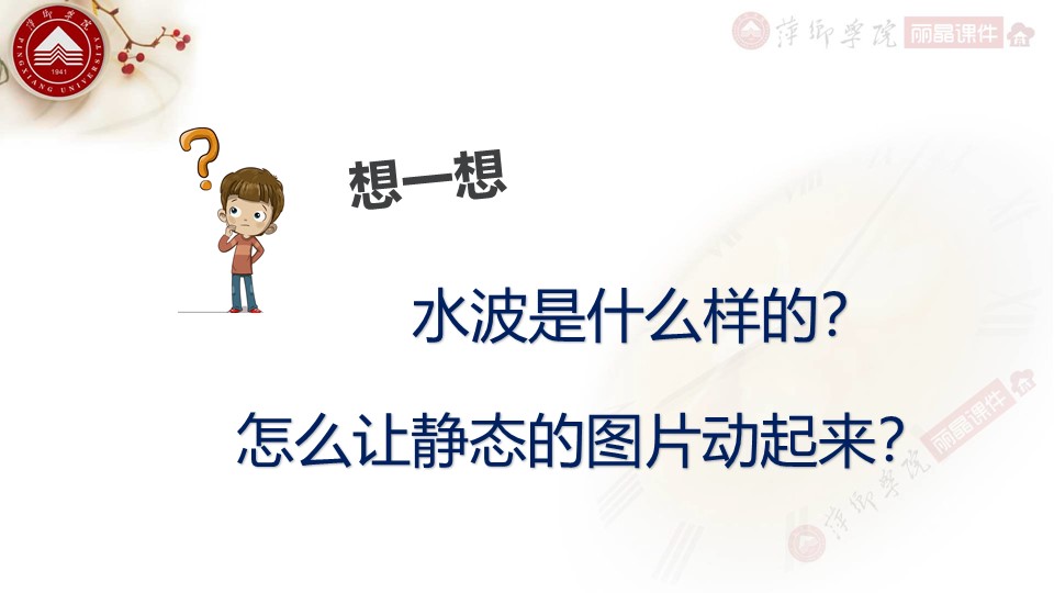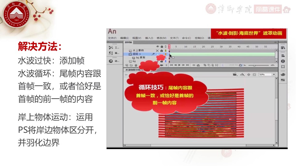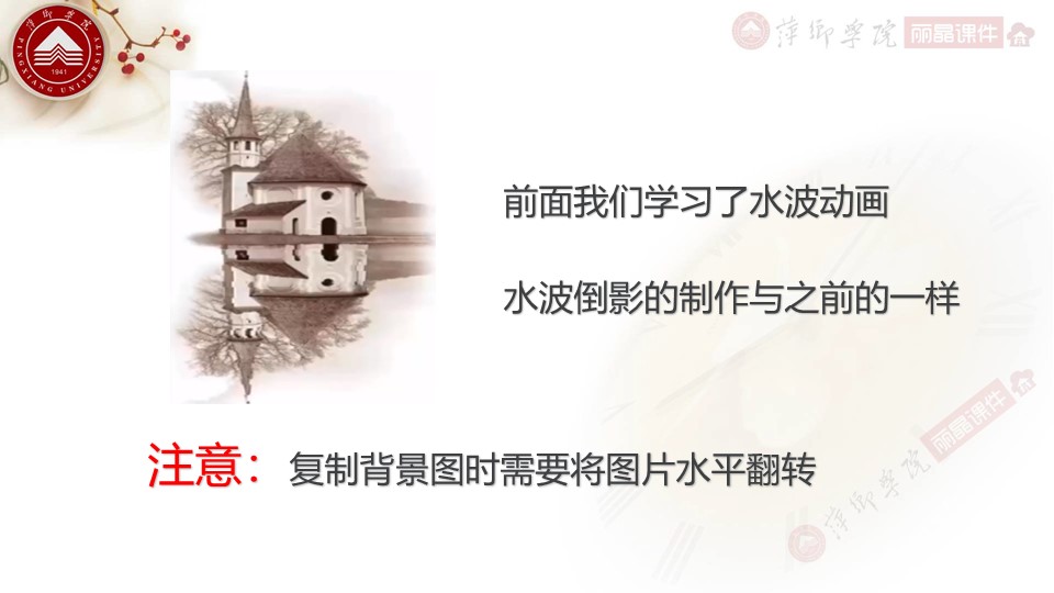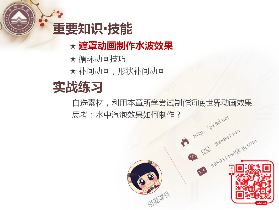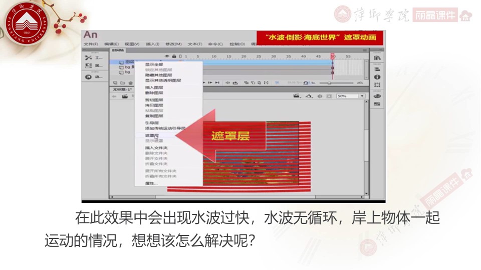 Flash是个用途广泛的二维动画制作软件,这一章我们的课题是遮罩动画技术,在本章中我们将学习:水波、倒影、海底世界,这类依靠遮罩动画技术实现的动画效果的制作,我们将分四个部分进行讲解。