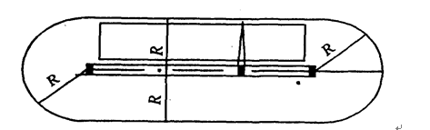 它是以塔轨两端有效端点的轨道中点为圆心,以最大回转半径为半径画出两个半圆,连接两个半圆,即为塔式起重机服务范围,如图所示。