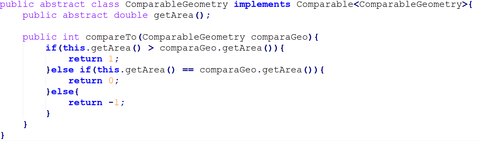 ComparableGeometry实现了Comparable<>接口,<>中的是泛型类型,这里针对几何图形进行比较,所以采用Comparable<ComparableGeometry>。实现接口中的compareTo方法,编写比较操作的业务代码,如果当前对象面积大则返回正数1,相等则返回0,面积较小则返回负数-1。