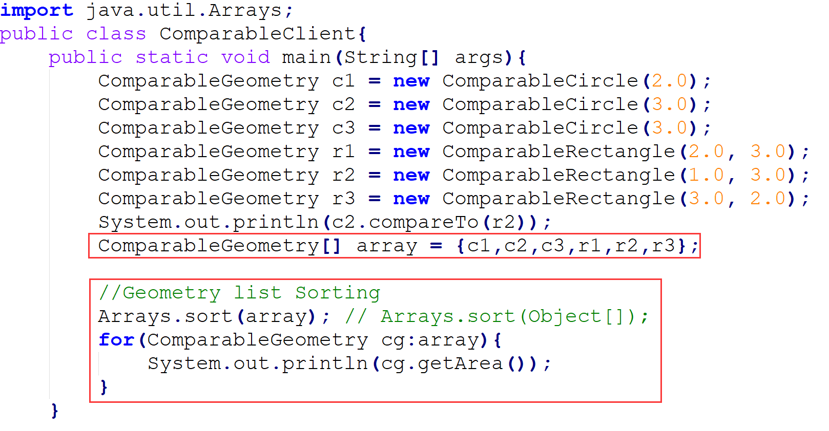 ComparableGeometry数组中既有矩形,也有圆形,进行排序时,不需要自己编写排序算法,直接用Java API提供的就可以了,Java API这种“超预见”的设计就是由面向抽象编程实现的,在以后的应用中,只要不是特殊需要,我们不用编写任何排序算法。
