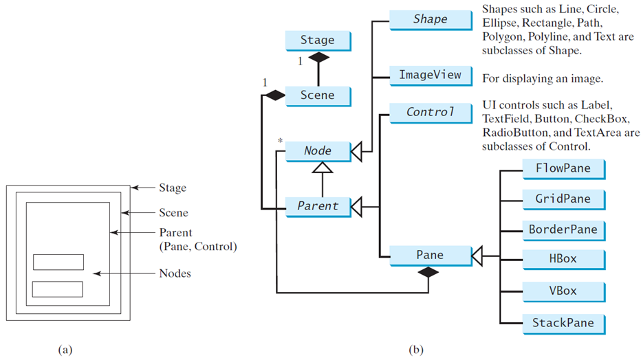 Scene中的元素以节点(Node)的形式组织,节点分为三种:Shape、ImageView和Parent,Parent类型的节点又分为控件(Control)和面板(Pane)两种类型。Control提供了图形界面主要的交互功能,例如按钮、文本框、复选框等;Pane提供了图形界面主要的排版(Layout)功能。从上图还能看到一些组合关系,Scene和Parent之间有个1对1的组合关系,Scene必须制定一个根节点,这个根节点必须是Parent类型的;Pane和Node之间存在1对多的组合关系,就是说一个面板上可以放置任何数量任何类型的节点,包括面板节点,我们可以利用面板节点之间的组合和嵌套关系来设计复杂的界面。