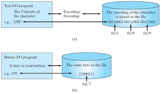 Text I/O requires encoding and decoding. The JVM converts a Unicode to a file specific encoding when writing a character and coverts a file specific encoding to a Unicode when reading a character. Binary I/O does not require conversions. When you write a byte to a file, the original byte is copied into the file. When you read a byte from a file, the exact byte in the file is returned.