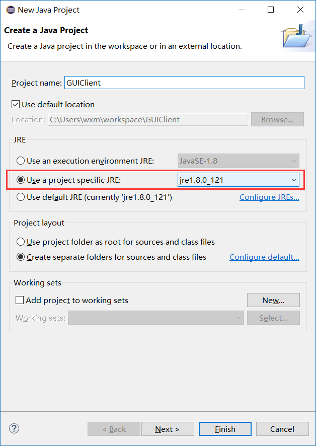 (1). 对于新建的Java项目,在项目信息配置框中,选择我们自己安装的JDK环境,如下所示: