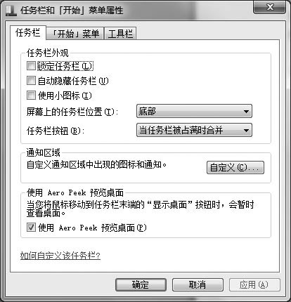 在任务栏空白区域单击鼠标右键,选择快捷菜单中的“属性”命令,打开“任务栏和「开始」菜单属性”对话框,如图 2-13所示。在“任务栏”选项卡中,我们可以对任务栏的外观和位置进行设置。