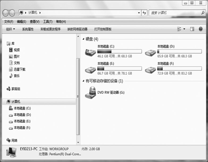 Windows 系列操作系统及其应用程序采用图形化界面,只要运行某个应用程序或打开某个文档,就会对应出现一个矩形区域,这个矩形区域称为窗口。虽然Windows窗口的内容各不相同,但是不论在外观、风格还是在操作方式上都高度统一。图2-1所示为“计算机”窗口。