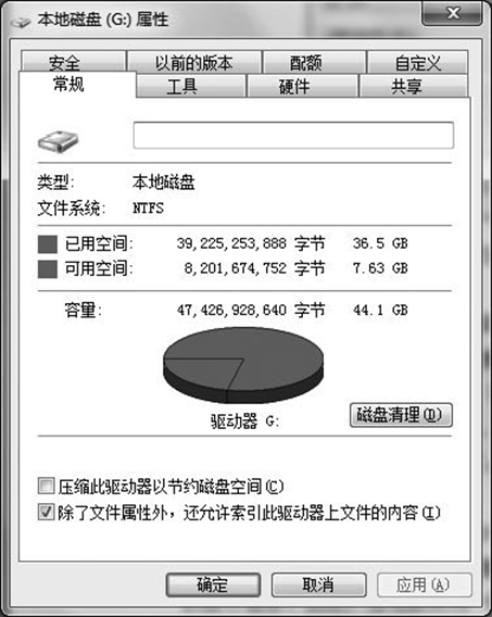 •右击要清理的磁盘分区,在出现的快捷菜单中单击“属性”选项,将出现磁盘属性对话框,如图2-48所示。