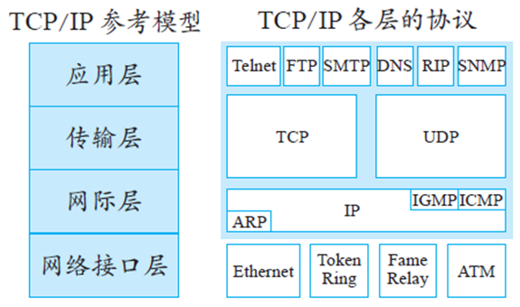 TCP/IP参考模型中没有数据链路层和物理层,只有网络与数据链路层的接口,可以使用各种现有的链路层、物理层协议。