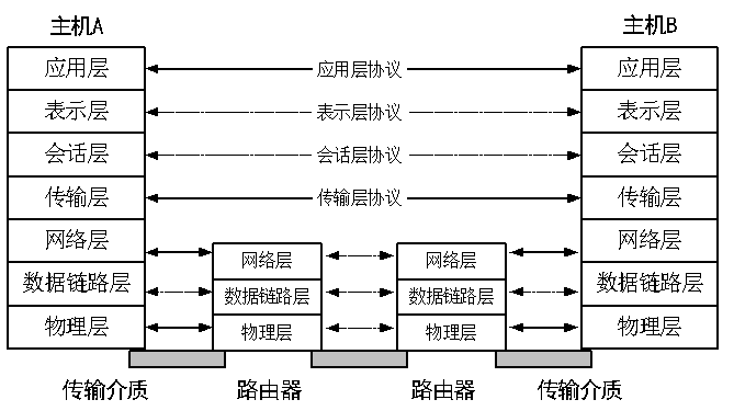 OSI参考模型将网络的功能划分为7个层次:物理层、数据链路层、网络层、传输层、会话层、表示层和应用层。如图所示。