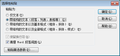 在Dreamweaver 的“编辑”菜单中有两个粘贴命令:“粘贴”和“选择性粘贴”。当选择“选择性粘贴”时,将出现一个包含几个粘贴格式设置选项的对话框。●“ 仅文本”可以插入无格式文本。如果原始文本带格式,则所有格式将被删除。 ●“ 带结构的文本”可以插入文本并保留结构,但不保留基本格式设置。例如,可以粘贴文 本并保留段落、列表和表格的结构,但不保留粗体、斜体和其他格式设置。