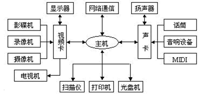 与通用的PC机相比,多媒体计算机的主要硬件除了常规的硬件如主机、内存储器、软盘驱动器、硬盘驱动器、显示器和网卡之外,还要有光盘驱动器、音频信息处理硬件和视频信息处理硬件等部分。下图所示为具有基本功能的多媒体计算机硬件系统。
