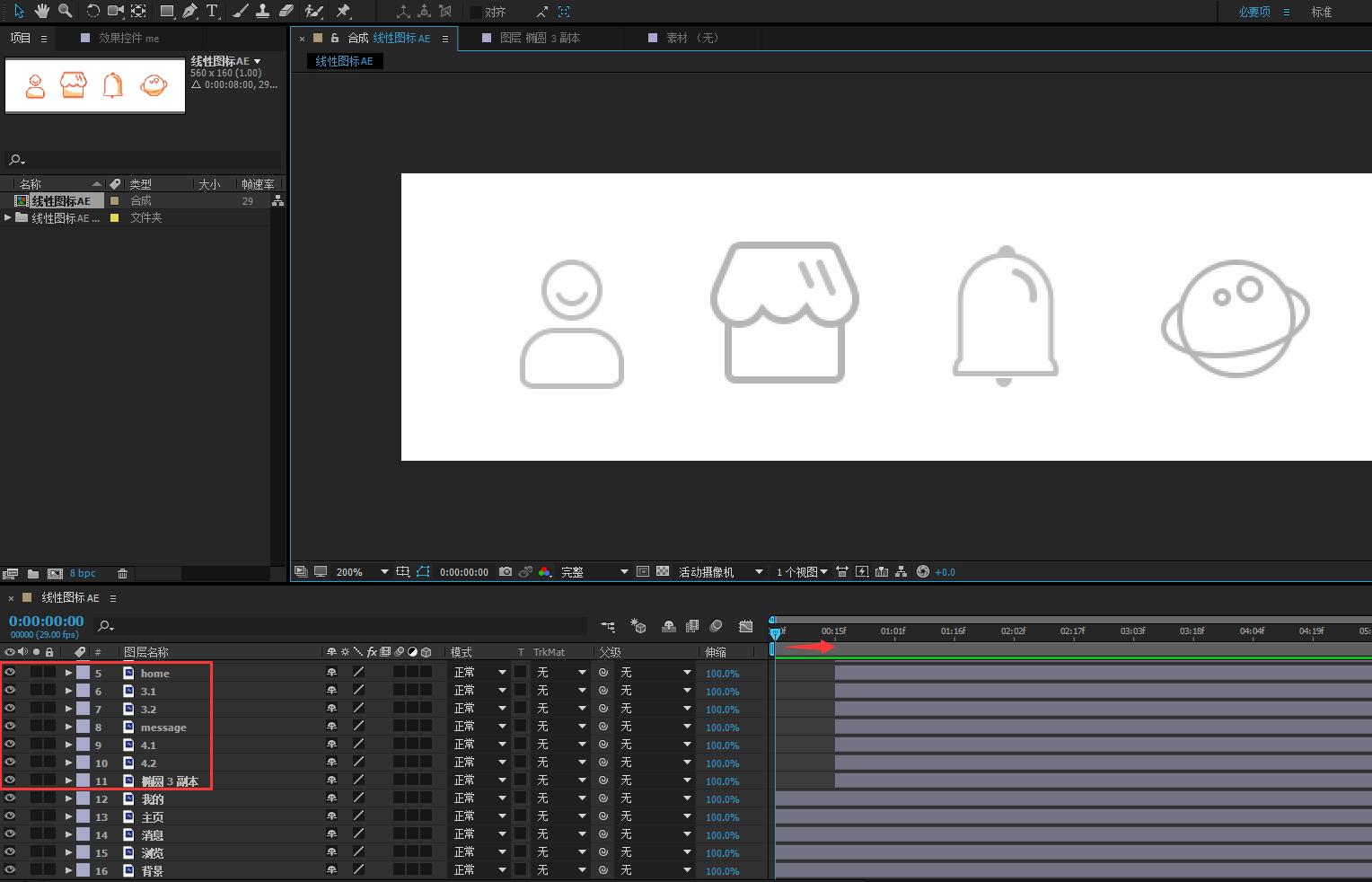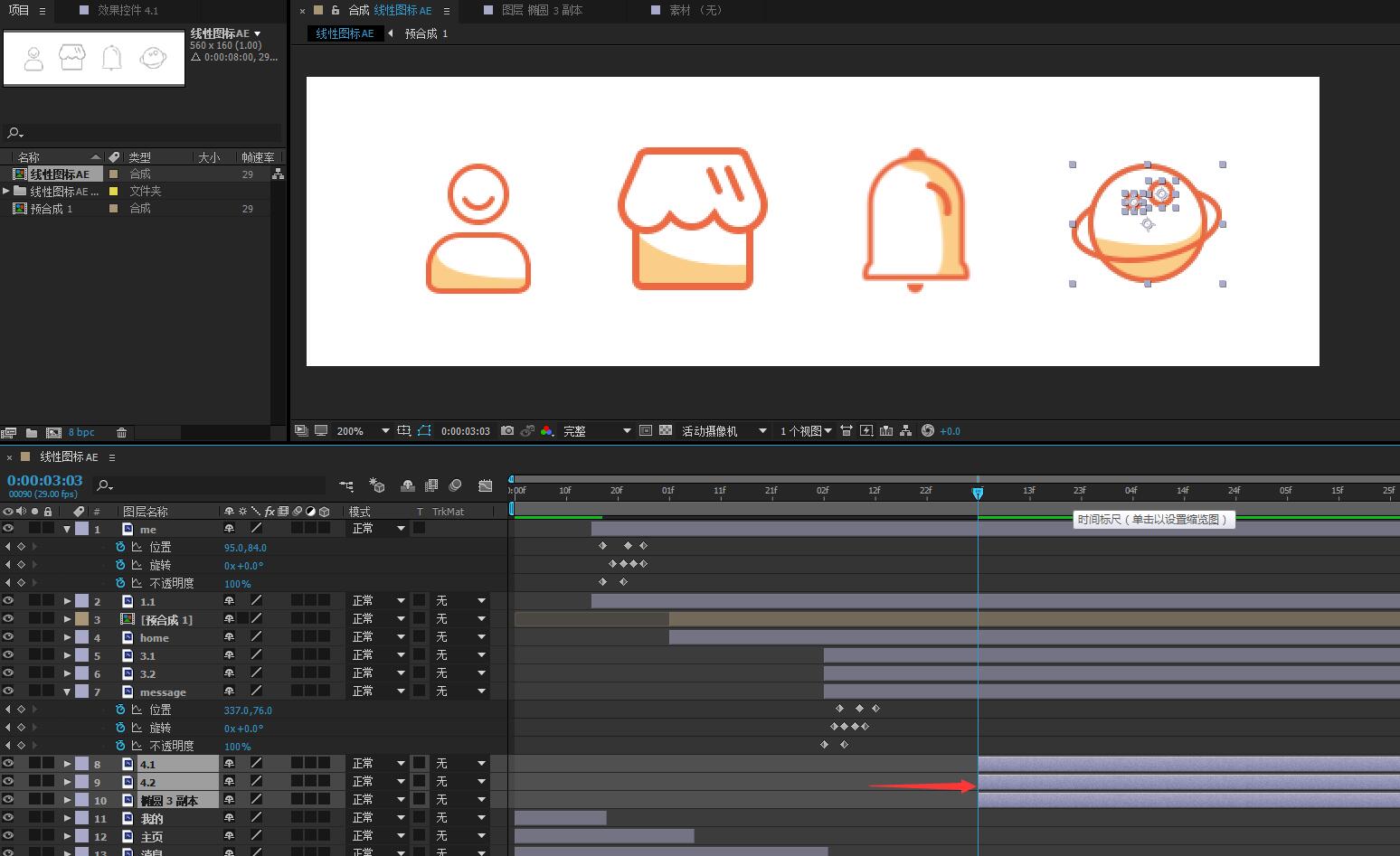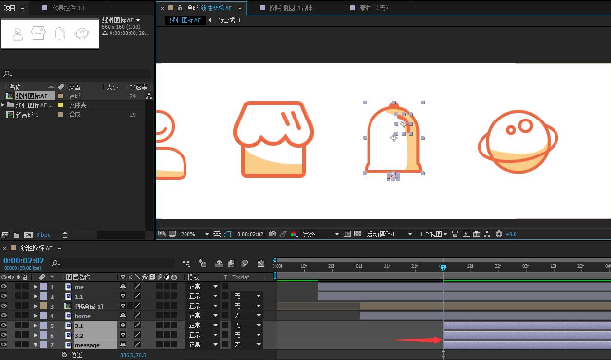 14.将第三个图标“消息”相关图层拖动至第二个图标完成动效之后。