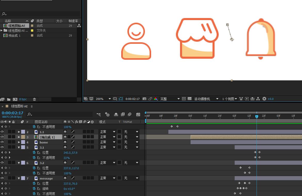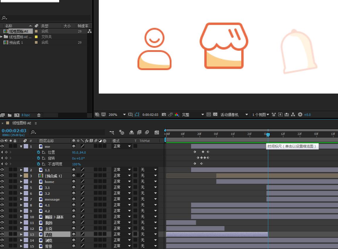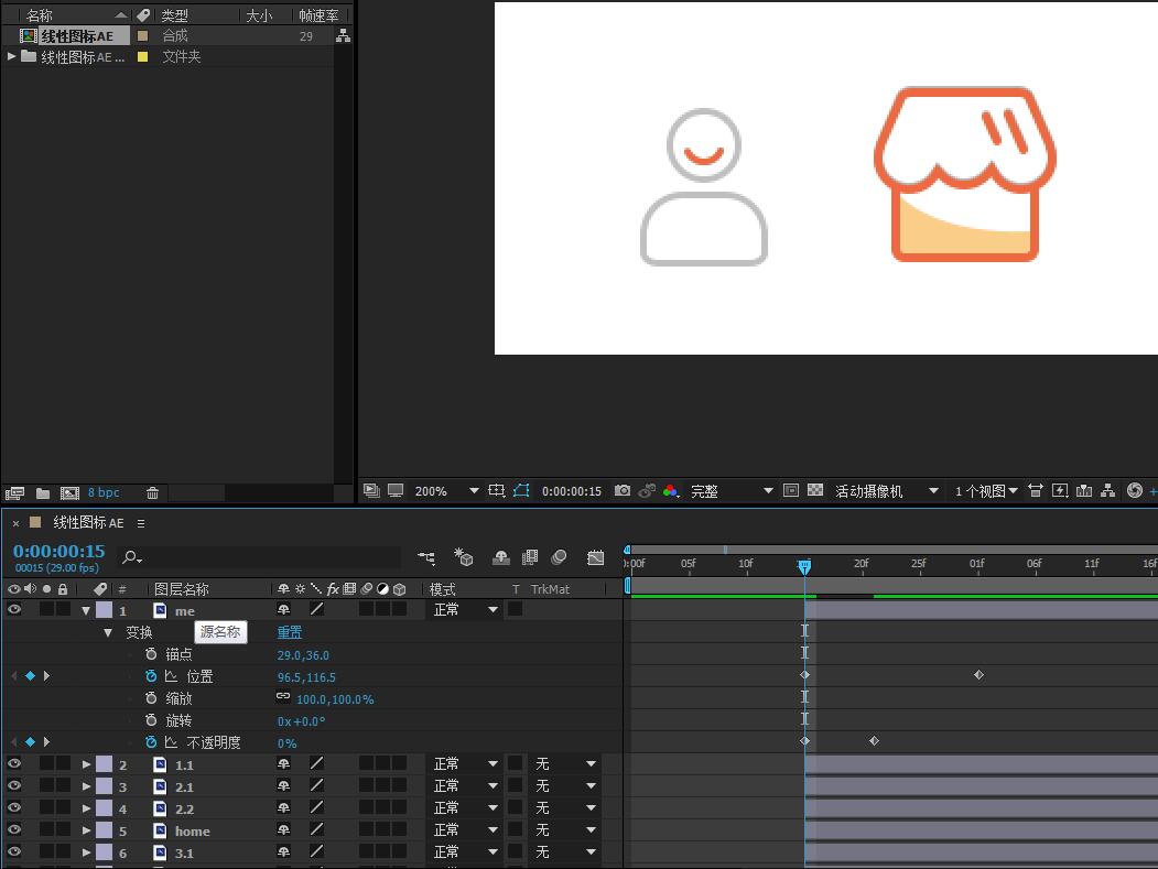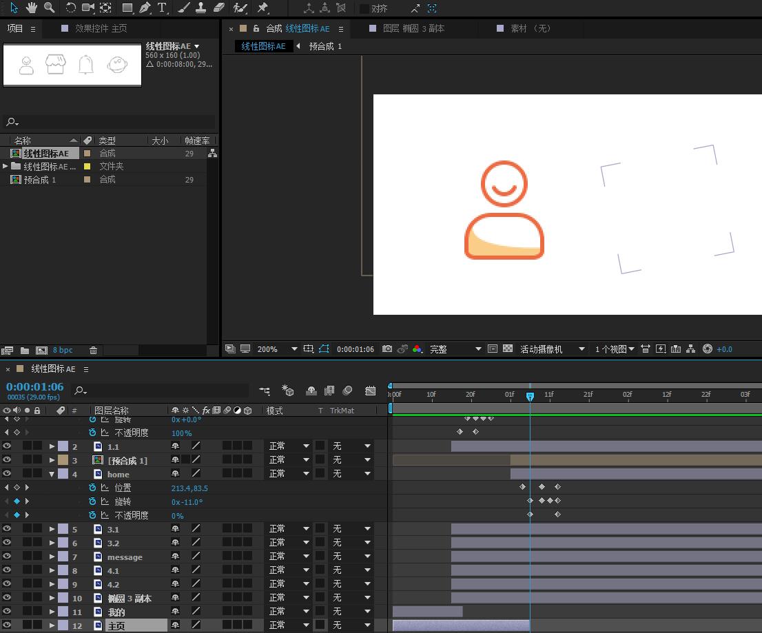 10.将第二个图标“主页”相关图层拖动至第一个图标完成动效之后。并给主页图标设置位置、旋转、不透明度 的关键帧。如同第一个图标一样,也可以将第一个图标的所有关键帧复制粘贴给第二个图标。