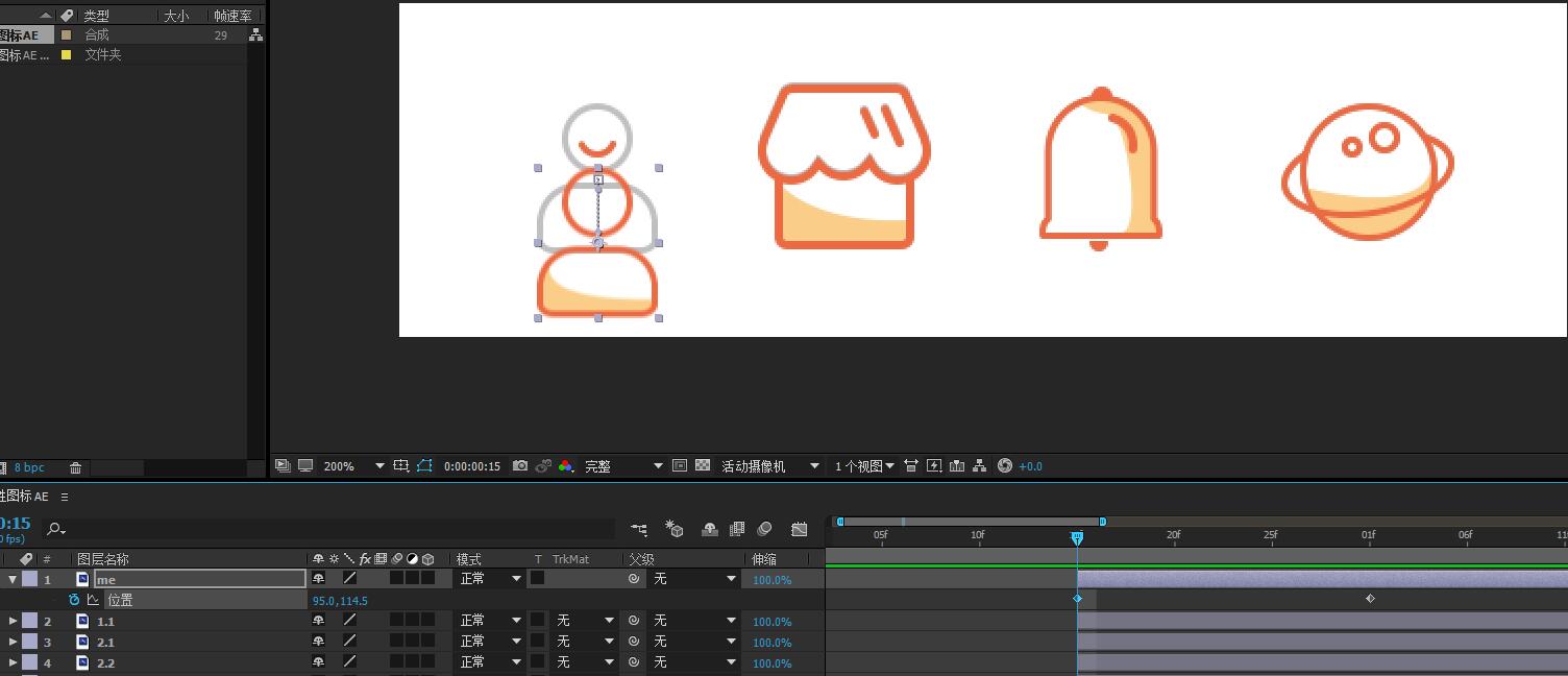 5.选中彩色“我的”图标图层,按P键设置位移关键帧。第一帧为95、114。