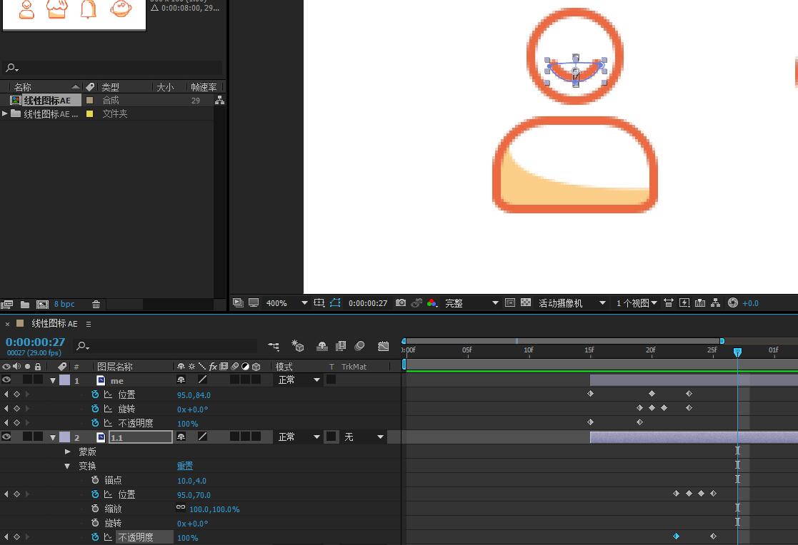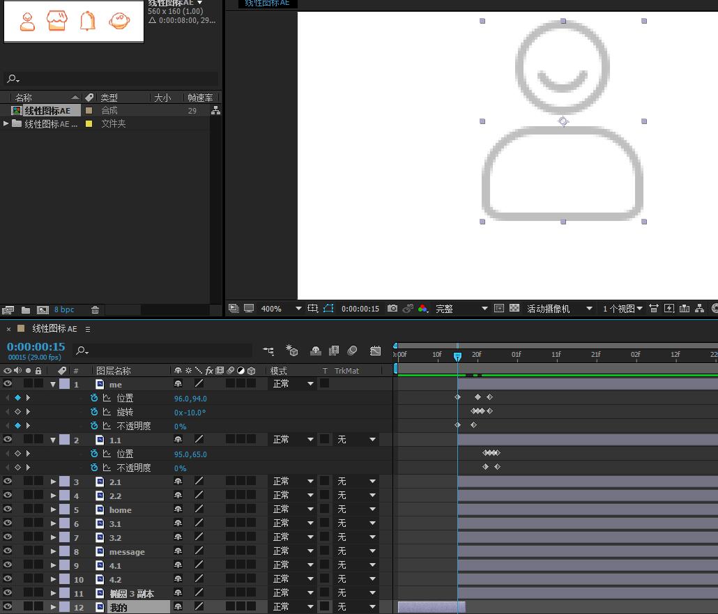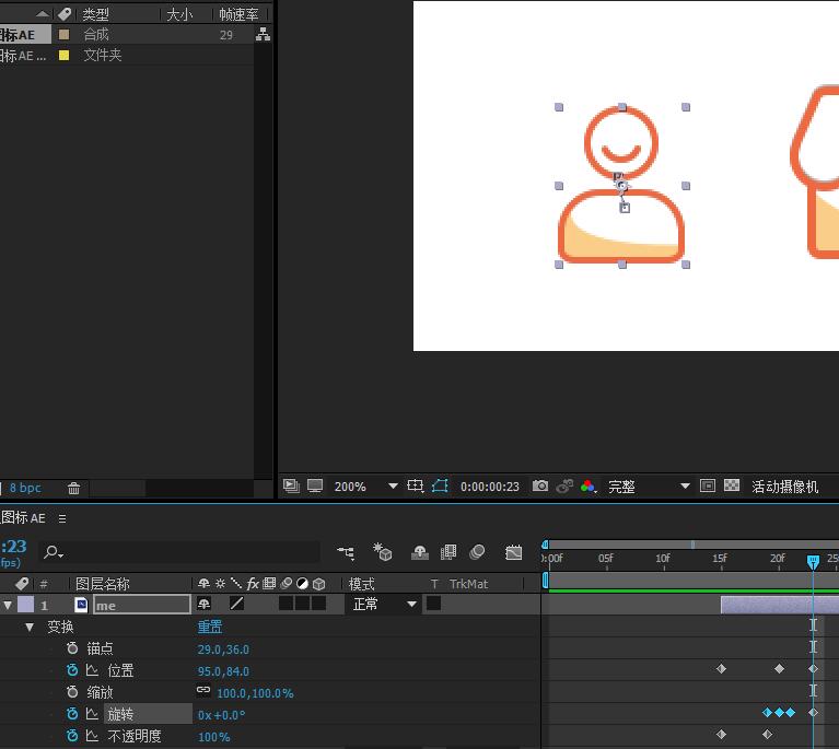 8.将“我的”图标上的笑脸图层在30帧之后设置位置、旋转、不透明度的关键帧。