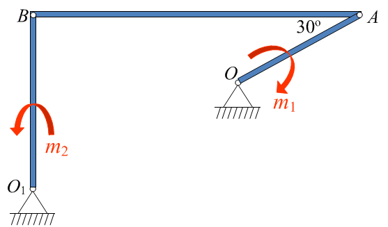 图示铰链四连杆机构OABO1处于平衡位置.已知OA=40cm, O1B=60cm, M1=1N·m,各杆自重不计,试求力偶矩M2的大小及杆AB所受的力。