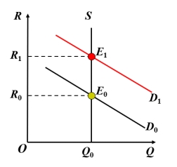 图2中:由于土地的供给曲线垂直且固定不变,故地租完全由土地的需求曲线决定:随着需求曲线的上升而上升,随着需求曲线的下降而下降。如果需求曲线下降到D',则地租将消失。