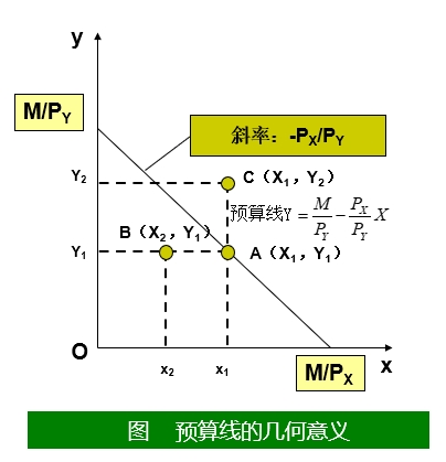 (4)预算线以内的点(B点):表示消费者购买该点的商品组合后收入还有剩余;(5)预算线以外的点(C点):表示超越了消费者现有的实际购买能力的消费组合;(6)预算线上的点A点):表示消费者既定收入所能购买的两种商品最大数量组合。