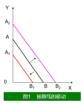 如图1,收入增加,预算线向右上方平移(ABA2B2),收入减少,预算线向左下方平移(AB→A1B1);
