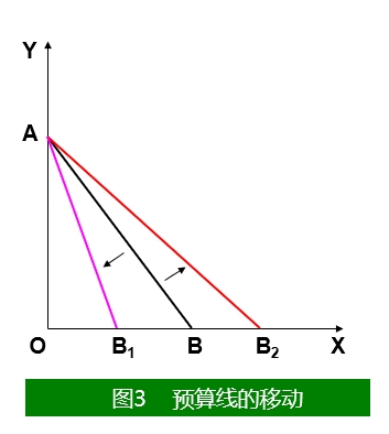 如图3,X商品的价格上升,预算线将绕着它与纵轴的交点(A点)向内转动( AB→AB1 );