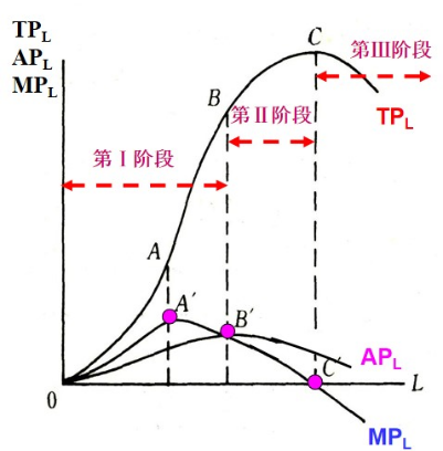 开始下降。这表明在这一阶段,可变要素劳动投入过多,理性的厂商不会在这一区域进行生产,而是通过减少可变要素投入量来增加总产量,并退回到第第Ⅱ阶段。