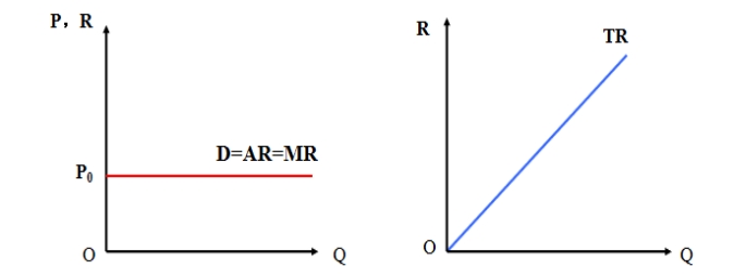 由于厂商只能接受市场既定的价格,因此,对于一个厂商来说,他所面对的价格只有一个,他所面对的需求曲线就不是一条随价格变动而向右下方倾斜的曲线,而是一条与横轴平行的水平线,如右图。