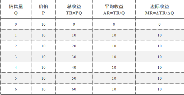 完全竞争市场的平均收益: 厂商按既定的市场价格出售商品,每单位产品的售价也是每单位产品的平均收益。所以价格等于平均收益。