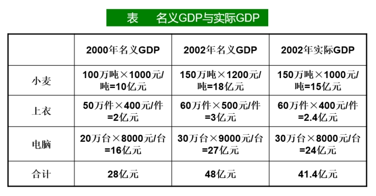 从2000—2002年,GDP名义上从28亿元增加到48亿元,但实际上增加到41.4亿元,剔除物价变动因素,GDP 只增长了47.9%%[(41.4-28)÷28=47.9%%],而名义上却增长了71.4%%[(48-28)÷28=71.4%%]