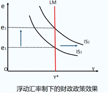在资本完全流动的条件下,党政府采取扩张性的货币政策时,LM1曲线右移到LM2的位置,形成新的均衡点B。此时,名义汇率由e1下降到e2,产出由Y1增加到Y2。