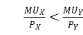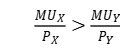 消费者花费1单位货币购买第X商品获得的边际效用大于花费1单位货币购买Y商品得到的边际效用。在这种情况下,如果消费者把用于购买Y商品的1单位收入转向购买X商品,支出保持不变,但通过这种调整所增加的效用为Mux/Px,所损失的效用为Muy/Py,前者大于后者。因此消费者通过调整商品的消费数量,可以使得自身效用满足增加。