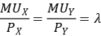 当增加1单位商品消费获得的效用超过为此付出的代价,即MU>λP时,消费者就会增加商品的消费;相反,当MU<λP,消费者就会减少消费数量。因此,当二者相等时,消费者处于最优状态并将不再调整消费数量,即消费者实现均衡的条件是MU=λP或者MU/P=λ。
