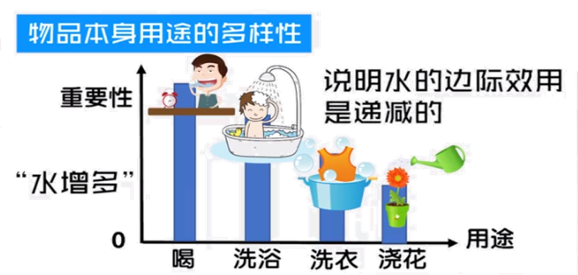 每种物品有多种用途,当把第一单位用于最重要的用途时,其边际效用最大,当把第二单位用于次要用途时,其边际效用减小,按顺序继续用下去,其用途越来越不重要,边际效用也越来越小。(水的用途多样性)