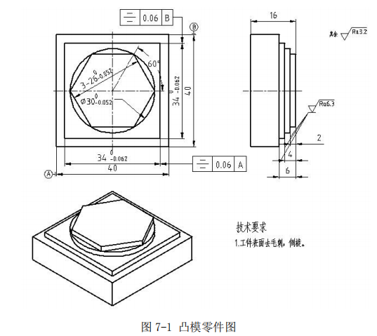 如图 7-1 所示,已知毛坯规格为 40 mm ×40mm ×16mm,材料为 45 钢,毛坯六面已加工,要求编制凸模零件加工程序并完成零件的加工。 ![]() | |
