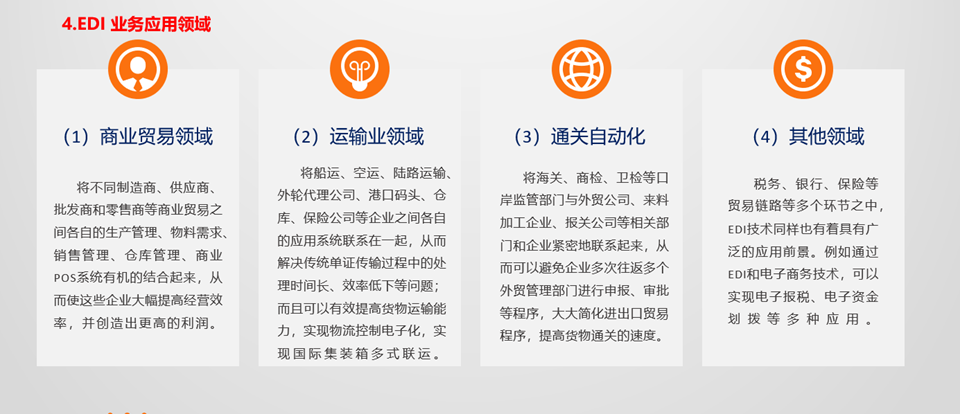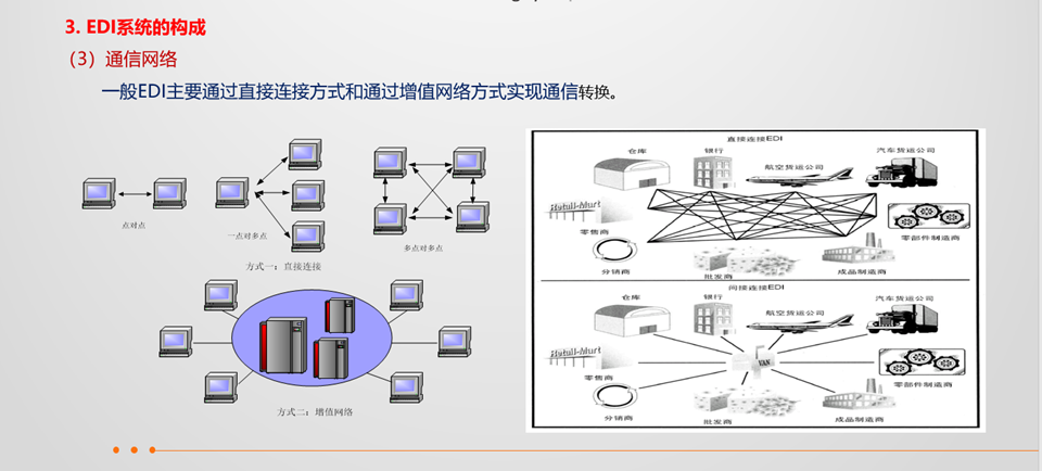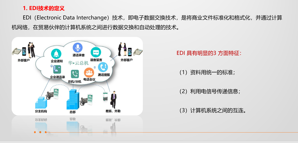 电子数据交换(EDI:Electronic Data Interchange)开始于20世纪60年代,EDI的含义是指商业贸易伙伴之间,将按标准、协议规范化和格式化的经济信息通过电子数据网络,在单位的计算机系统之间进行自动交换和处理,它是电子商业贸易的一种工具,将商业文件按统一的标准编制成计算机能识别和处理的数据格式,在计算机之间进行传输。